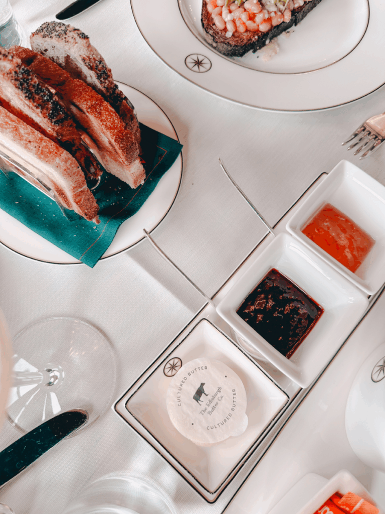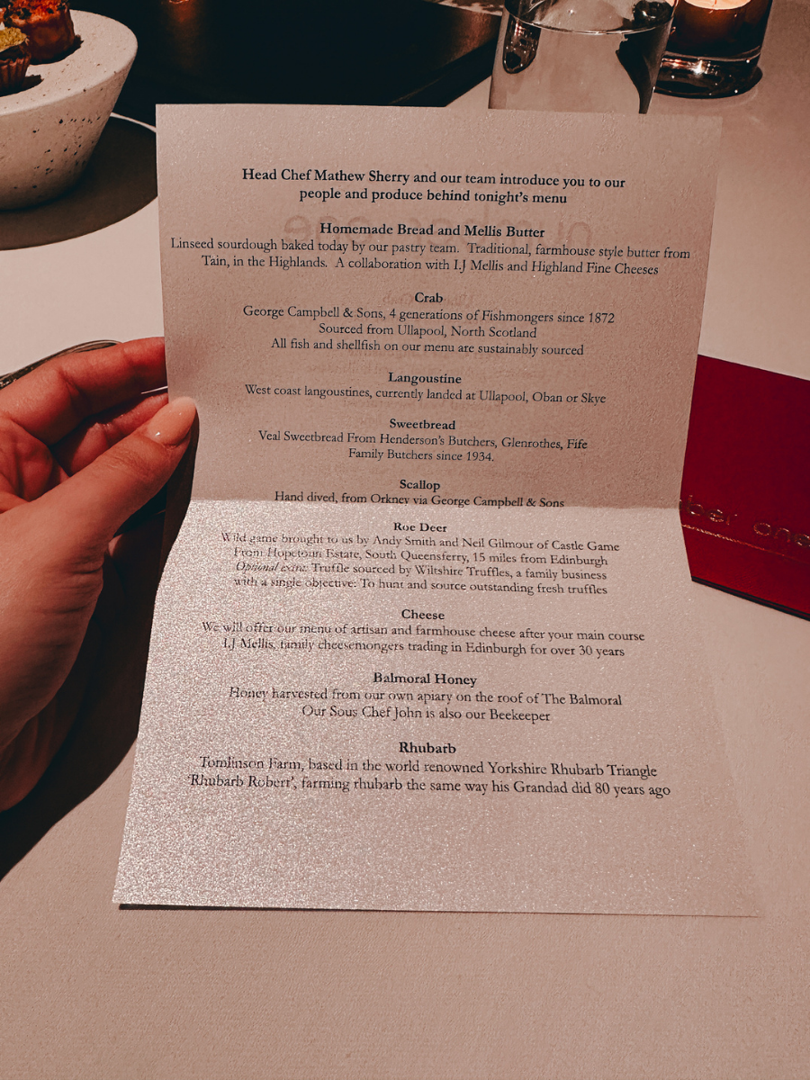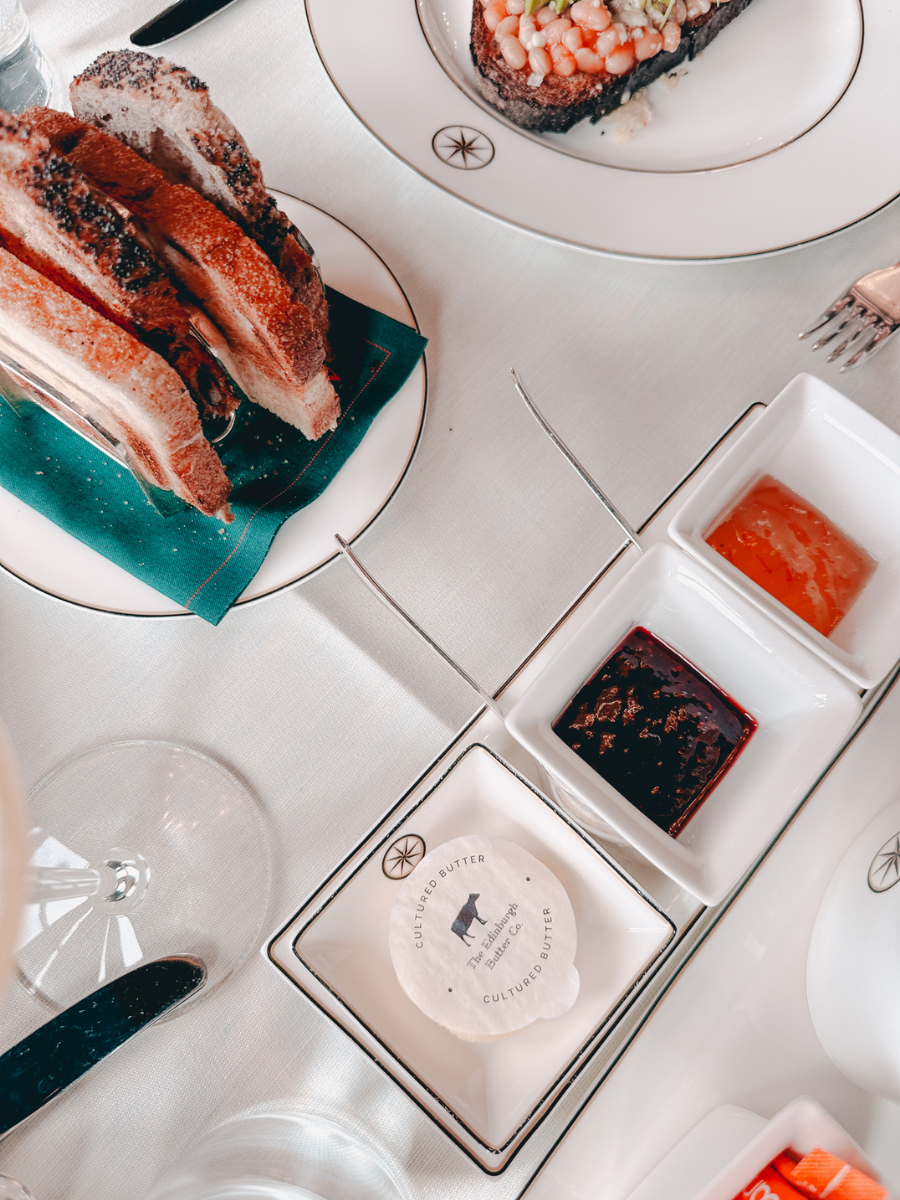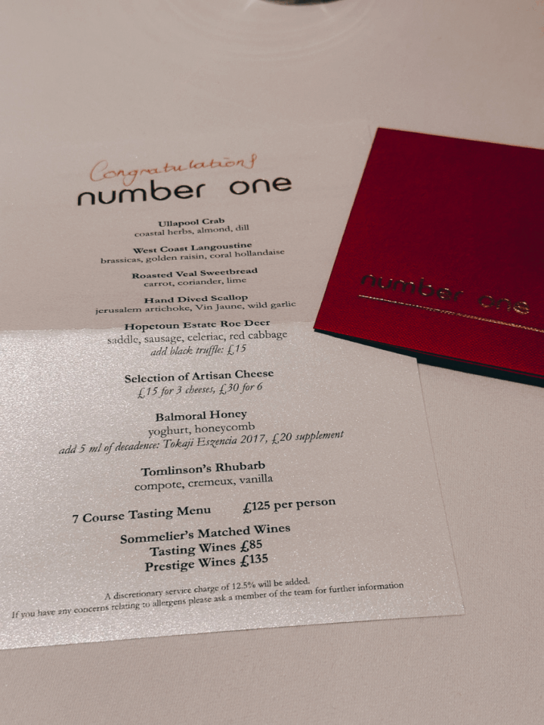 One of the highlights of our stay at The Balmoral was dinner at Number One, the hotel’s signature fine-dining restaurant. It was also the fanciest dining experience we’ve ever had. The level of service was immediately noticeable (at one point our waiter quietly scraped our toast crumbs from the table… something we’d never experienced before), which definitely made us feel a little self-conscious at first, but in a “wow-this-is-fancy” kind of way.