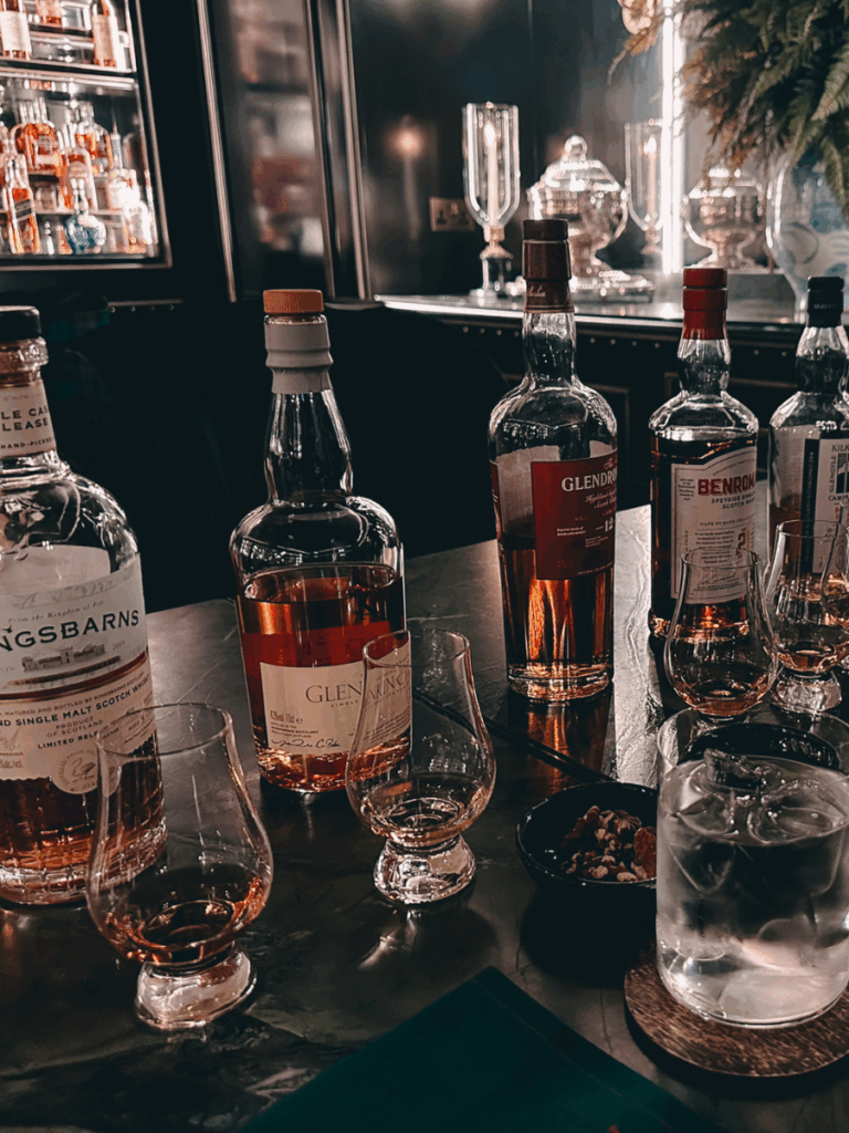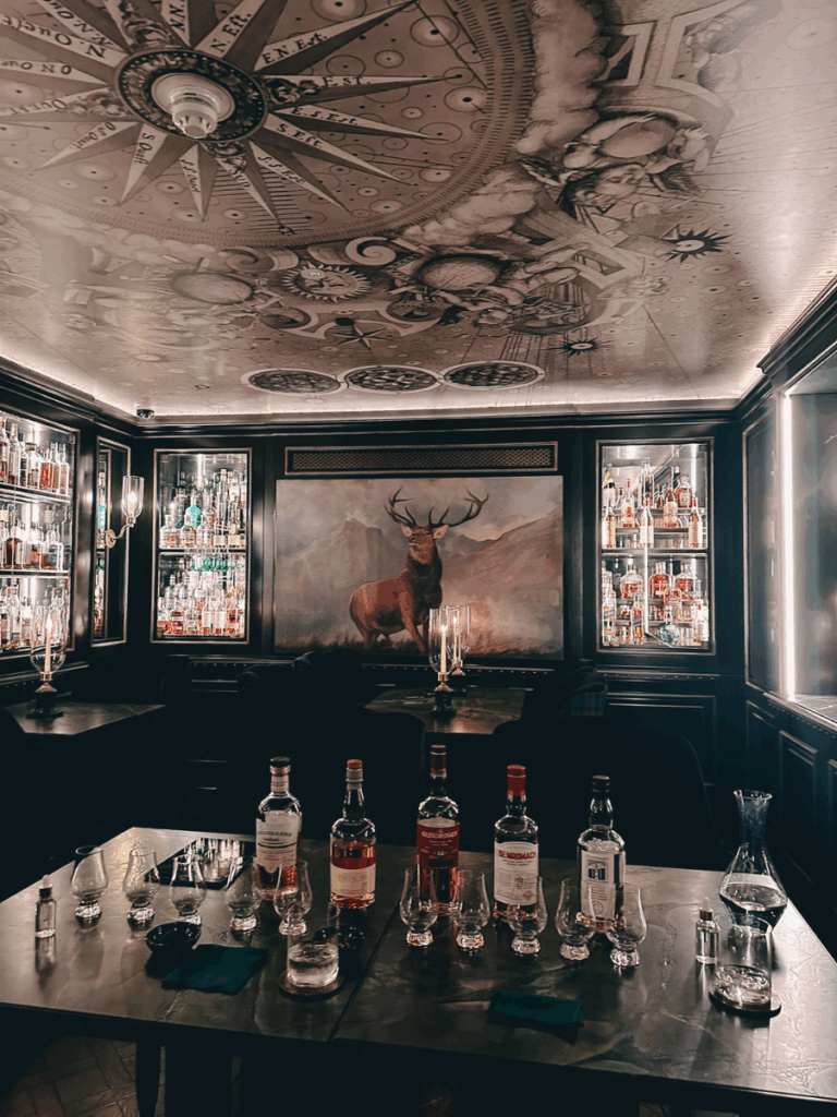 That same second-floor space became the heart of our stay. We enjoyed both dinner and breakfast there, lingering over meals in a setting that felt intimate and relaxed rather than formal. Later that evening, we returned for dinner at the hotel. After dinner, we were welcomed for the hotel’s in-house whisky tasting experience, which was held in a cozy, library-like room lined with bottles and warm lighting. It felt less like a lesson and more like a genuine introduction to Scotland’s whisky culture.