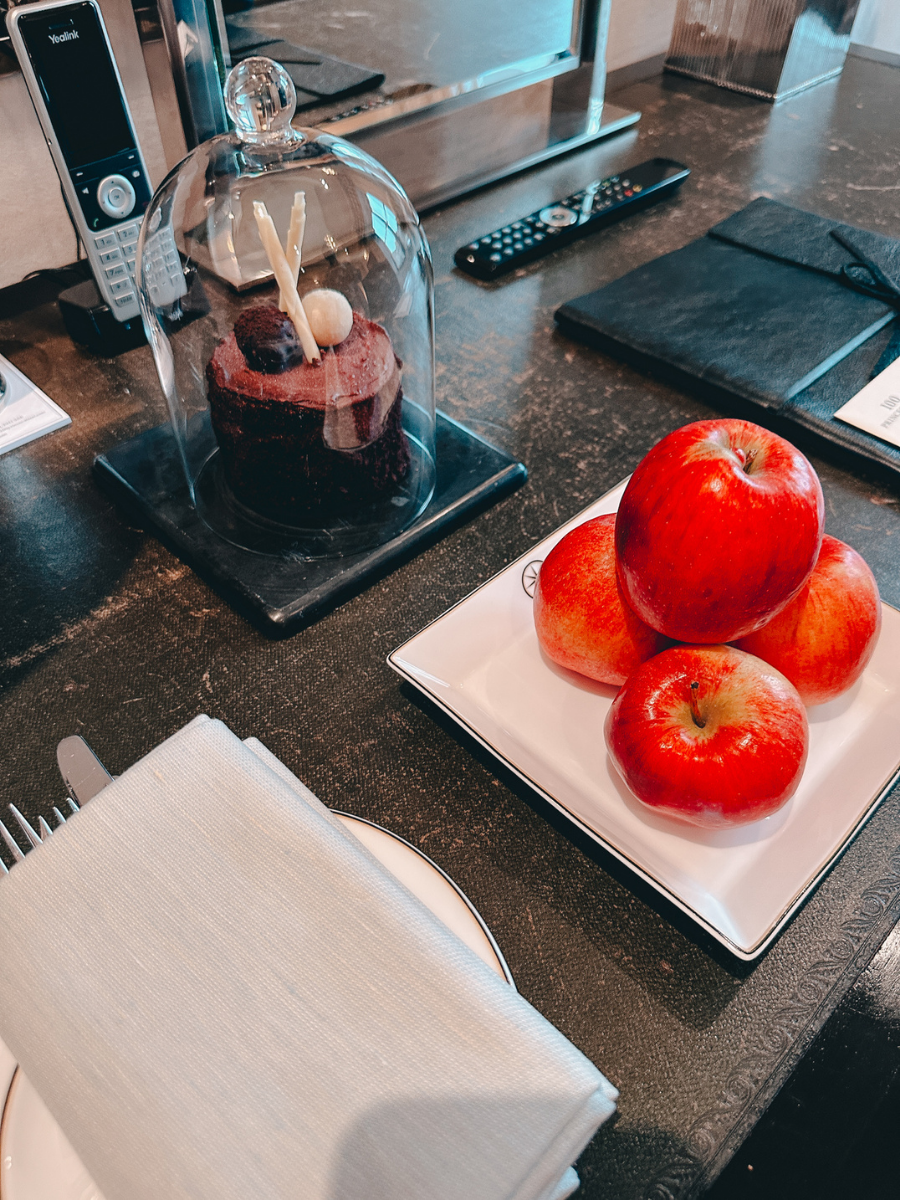 Check-in takes place on the second floor, which serves as the hotel’s guest care and dining area. Rather than a standard front desk, it feels like an elegant sitting room. We were greeted with champagne upon arrival, and the staff immediately took care of our luggage, bringing everything up to our room while we settled in. When we later entered the room, we found a small chocolate cake and fresh apples waiting for us, which was a thoughtful welcome amenity that felt especially meaningful at the start of our honeymoon.